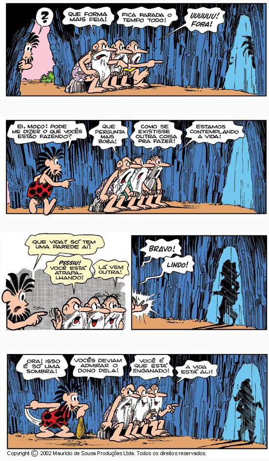 No entanto, em 2002, Maurício de Souza fez uma releitura desse mito e colocou literalmente um homem das cavernas como protagonista: Piteco. O Pithecanthropus erectus da Turma da Mônica propõe um olhar moderno sobre a narrativa platônica, mas dessa vez com relação à nossa relação com os meios de comunicação, as sombras atuais. Divirtam-se e boa leitura.
