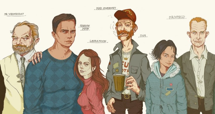 1. SHADOW MOON (protagonista): Ex-detento, de passado nebuloso, que pretende retomar sua vida tendo se arrependido de seu crime e disposto a uma vida nova. Acaba, devido a tragédia de sua esposa, tornando-se guarda-costas de um misterioso e velho trapaceiro, Wednesday, um antigo deus nórdico. |