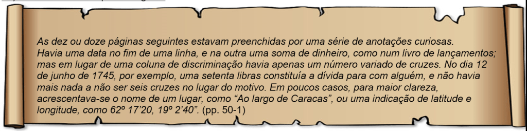 Este trecho revela o conteúdo do livro de anotações que vinha junto com o mapa do tesouro de Flint. Após sua leitura prévia do livro, explique com suas palavras o significado de tais anotações com o máximo de detalhes que conseguir se lembrar.